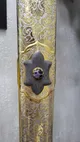 Каждый элемент доспеха изготовлен из благородных материалов и выполнен с максимальной тщательностью. Шлем, выполненный из сплава, украшен сложной резьбой, покрыт никелем и золотом высшей пробы (толщина 10 мкм), что придает ему неповторимый блеск. Меч, созданный из дамасской стали и украшенный натуральным камнем чароит, является символом мастерства и власти.